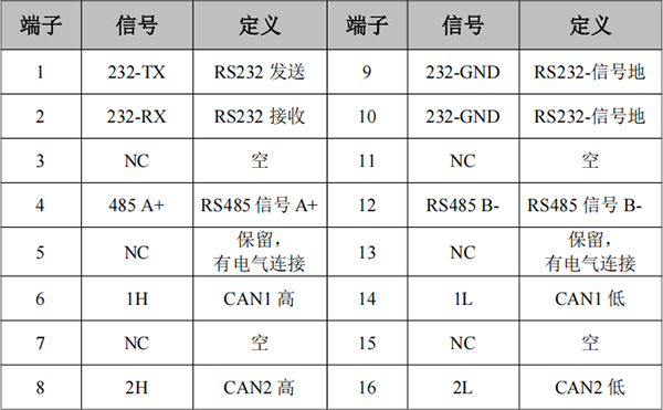 端子接口包括1個RS232、1個RS485,2個CAN總線接口,使用插拔式雙排彈簧按壓式端子引出。