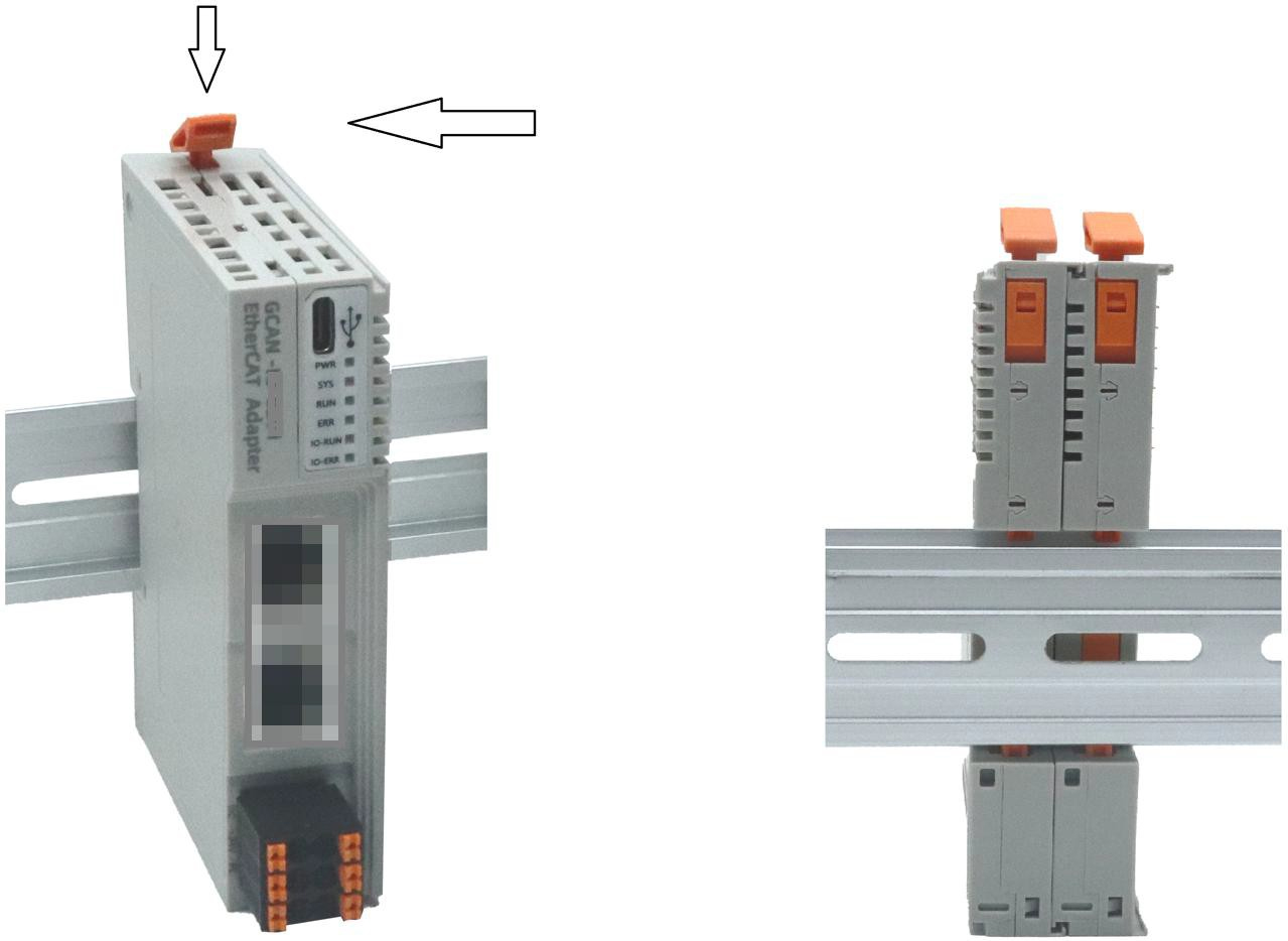 GCAN-PLC-325可編程邏輯控制器的安裝方法如圖2.3所示。首先把GCAN-PLC-325可編程邏輯控制器安裝在導(dǎo)軌上,再按下鎖扣并發(fā)出“咔”的一聲。