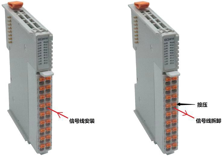 使用一字端子接頭的線纜,將端子接頭對準(zhǔn)相應(yīng)通道的圓孔插入即可;拆線時,需使用一字螺絲刀,插入需拆線的通道旁對應(yīng)橘黃色方形孔,用力向下按壓,此時相應(yīng)圓孔中的夾片會松動,線纜即可輕松拔出。