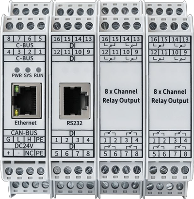 GCAN-GT-419模塊集成1路DC 24V電源接口、3路標準CAN-Bus接口、1路標準太網(wǎng)接口、1路RS232串行接口、2路RS485串行接口,16路數(shù)字量DI輸入和16路繼電器輸出。GCAN-GT-419模塊接線端子排如圖所示。