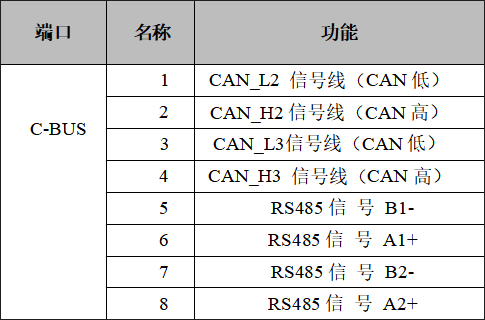 GCAN-GT-419模塊C-bus接口由2個4 Pin接線端子引出,有2個獨立的CAN接口,和2個獨立的485接口。其接口定義如表所示。