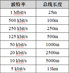 請注意:CAN-bus電纜可以使用普通雙絞線、屏蔽雙絞線。理論最大通信距離主要取決于總線波特率,最大總線長度和波特率關(guān)系詳見下表。若通訊距離超過1km,應(yīng)保證線的截面積大于Φ1.0mm2,具體規(guī)格應(yīng)根據(jù)距離而定,常規(guī)是隨距離的加長而適當加大。