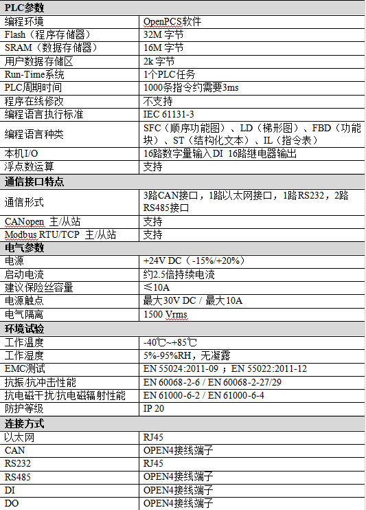 (1)高速的32位工業(yè)級處理器;(2)內(nèi)嵌硬件看門狗定時器;(3)使用外接電源供電(DC+24V,100mA);(4)靜電放電抗擾度等級:接觸放電±2KV,空氣放電±8KV;(5)電快速瞬變脈沖群抗擾度等級:±1KV;(6)浪涌抗擾度等級:±1KV;(7)工作濕度范圍:5%~95%RH無凝露;(8)3路CAN總線接口,1路以太網(wǎng)接口,1路RS232串行接口、2路RS485串行接口;(9)編程軟件:OpenPCS(符合IEC 61131-3標準);(10)支持CANopen協(xié)議主/從站功能;(11)支持Modbus TCP主/從站功能;(12)標準DIN導(dǎo)軌安裝方式,專為工業(yè)設(shè)計。(13)電氣隔離為1500 Vrms;(14)工作溫度范圍:-40℃~+85℃;(15)防護等級:IP20。- GCAN-PLC產(chǎn)品功能及應(yīng)用視頻: